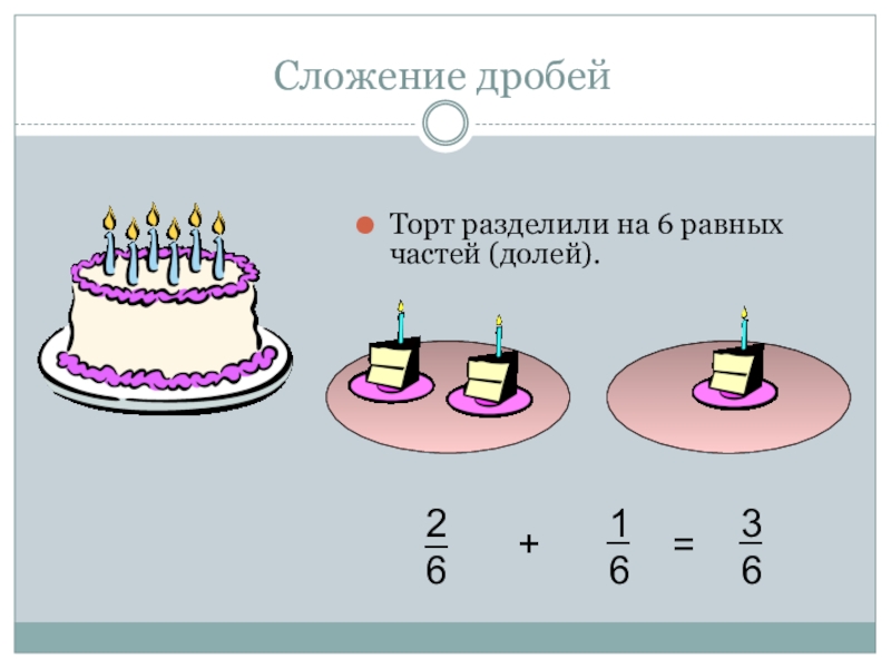 Сложение дробейТорт разделили на 6 равных частей (долей).2616_+36_=_