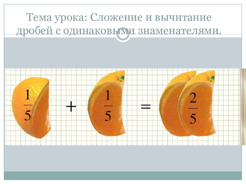 Слайд 3Тема урока: Сложение и вычитание дробей с одинаковыми знаменателями.