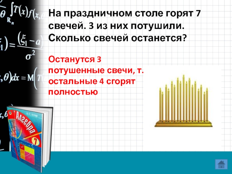 Останутся 3 потушенные свечи, т.к. остальные 4 сгорят полностью