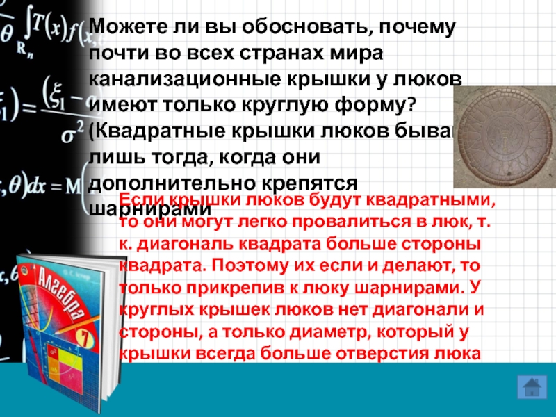 Если крышки люков будут квадратными, то они могут легко провалиться в люк, т.к. диагональ квадрата больше стороны квадрата. Поэтому их если и делают, то только прикрепив к люку шарнирами. У круглых крышек люков нет диагонали и стороны, а только диаметр, который у крышки всегда больше отверстия люка