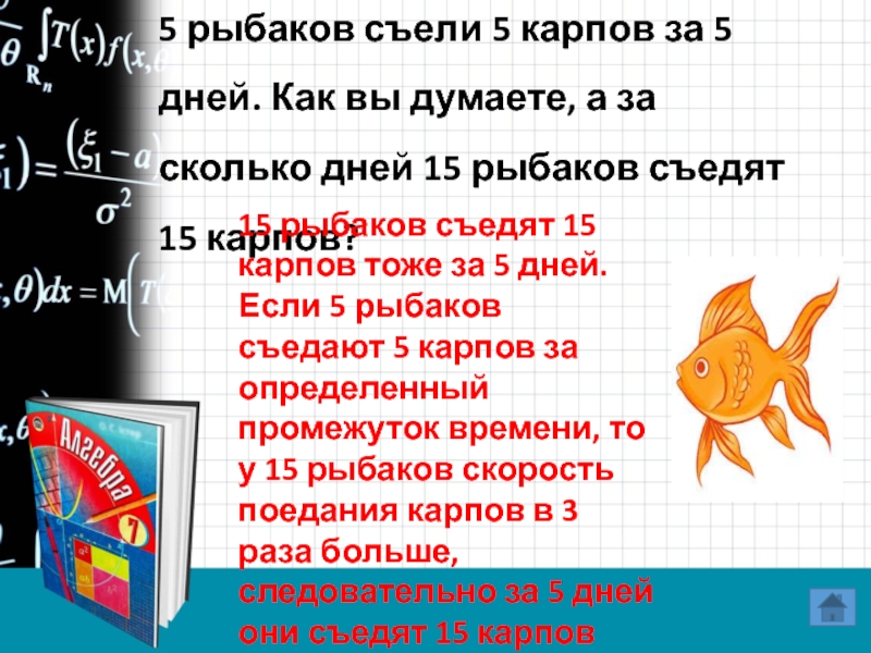 15 рыбаков съедят 15 карпов тоже за 5 дней. Если 5 рыбаков съедают 5 карпов за определенный промежуток времени, то у 15 рыбаков скорость поедания карпов в 3 раза больше, следовательно за 5 дней они съедят 15 карпов