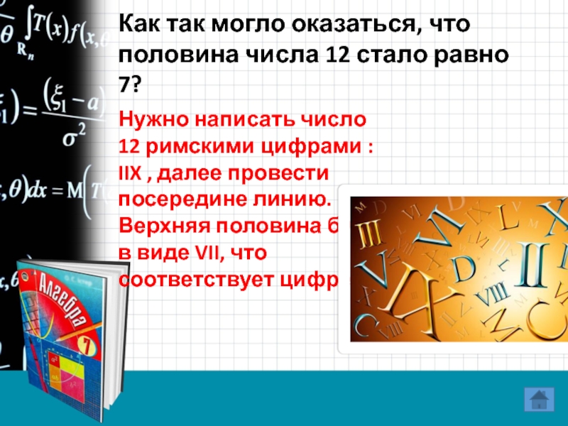 Нужно написать число 12 римскими цифрами : IIX , далее провести посередине линию. Верхняя половина будет в виде VII, что соответствует цифре 7.