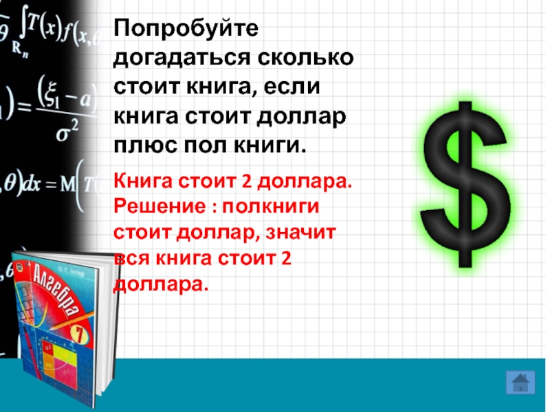 Книга стоит 2 доллара. Решение : полкниги стоит доллар, значит вся книга стоит 2 доллара.