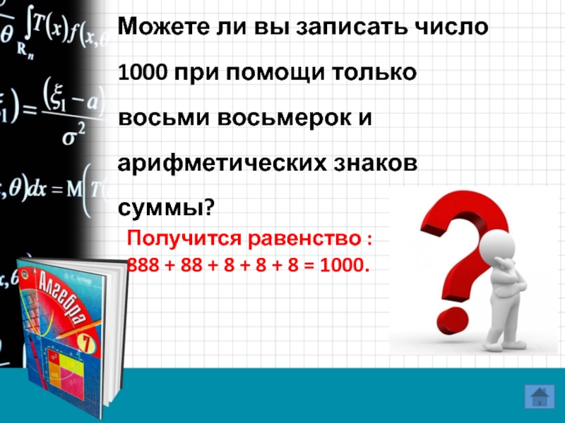 Получится равенство : 888 + 88 + 8 + 8 + 8 = 1000.