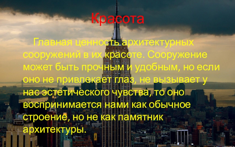 Сооружение может быть прочным и удобным, но если оно не привлекает глаз, не вызывает у нас эстетического чувства, то оно воспринимается нами как обычное строение, но не как памятник архитектуры.