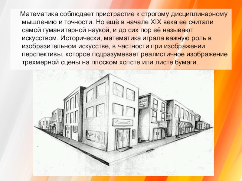Но ещё в начале XIX века ее считали самой гуманитарной наукой, и до сих пор её называют искусством. Исторически, математика играла важную роль в изобразительном искусстве, в частности при изображении перспективы, которое подразумевает реалистичное изображение трехмерной сцены на плоском холсте или листе бумаги.