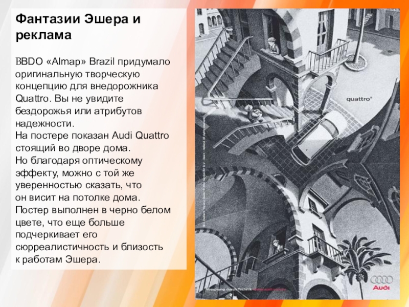 На постере показан Audi Quattro стоящий во дворе дома. Но благодаря оптическому эффекту, можно с той же уверенностью сказать, что он висит на потолке дома.