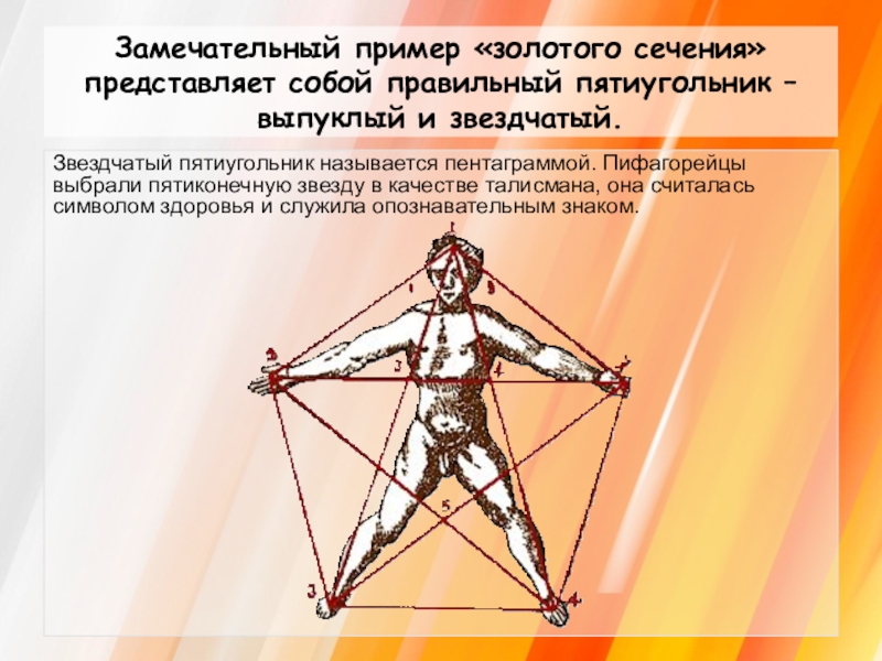 Слайд 6Замечательный пример «золотого сечения» представляет собой правильный пятиугольник – выпуклый и