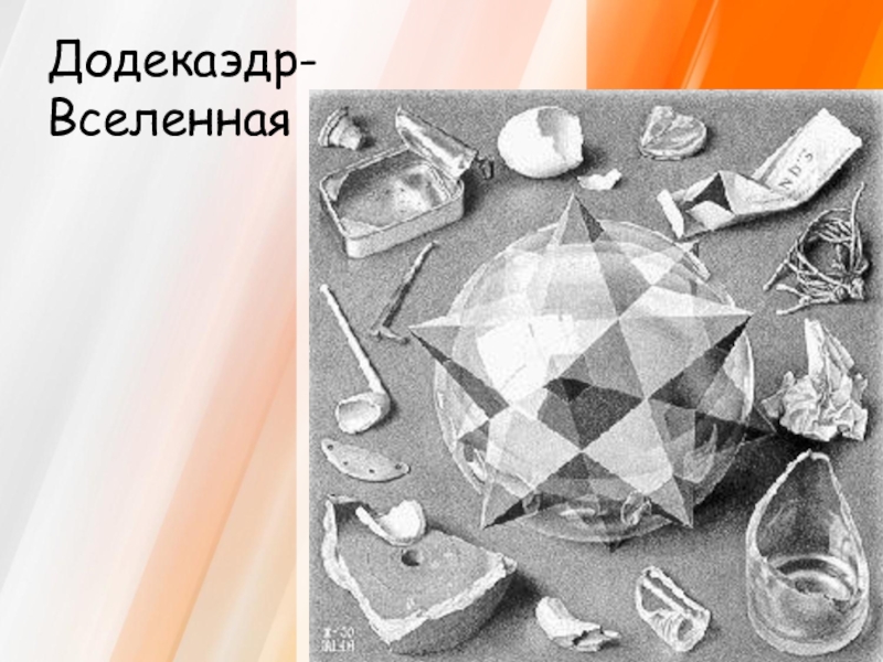 четырьмя элементами: огонь - тетраэдр, воздух - октаэдр, вода - икосаэдр, земля - куб. Далее, он писал, что существует пятая комбинация, которой Бог ограничил Мир, это додекаэдр.