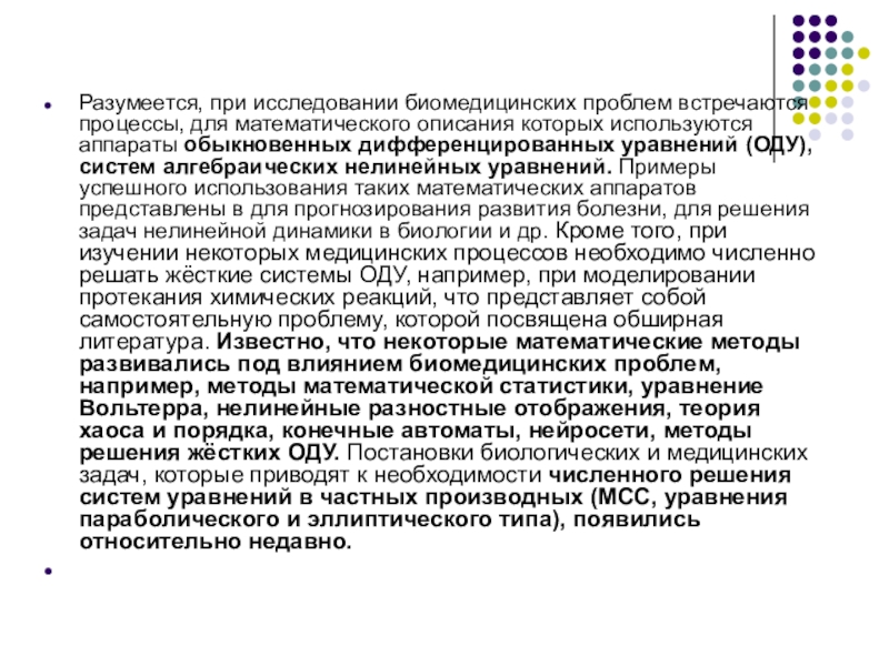 используются аппараты обыкновенных дифференцированных уравнений (ОДУ), систем алгебраических нелинейных уравнений. Примеры успешного использования таких математических аппаратов представлены в для прогнозирования развития болезни, для решения задач нелинейной динамики в биологии и др. Кроме того, при изучении некоторых медицинских процессов необходимо численно решать жёсткие системы ОДУ, например, при моделировании протекания химических реакций, что представляет собой самостоятельную проблему, которой посвящена обширная литература. Известно, что некоторые математические методы развивались под влиянием биомедицинских проблем, например, методы математической статистики, уравнение Вольтерра, нелинейные разностные отображения, теория хаоса и порядка, конечные автоматы, нейросети, методы решения жёстких ОДУ. Постановки биологических и медицинских задач, которые приводят к необходимости численного решения систем уравнений в частных производных (МСС, уравнения параболического и эллиптического типа), появились относительно недавно.