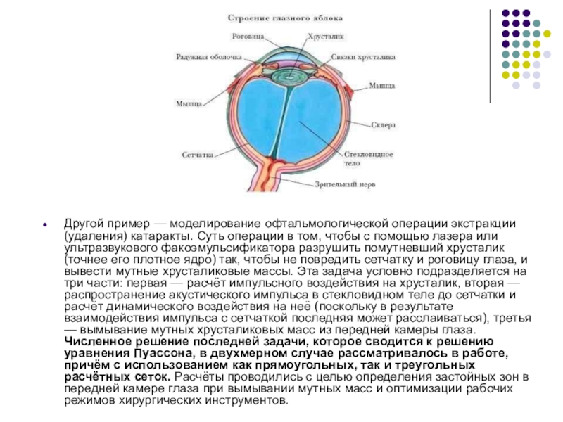 в том, чтобы с помощью лазера или ультразвукового факоэмульсификатора разрушить помутневший хрусталик (точнее его плотное ядро) так, чтобы не повредить сетчатку и роговицу глаза, и вывести мутные хрусталиковые массы. Эта задача условно подразделяется на три части: первая — расчёт импульсного воздействия на хрусталик, вторая — распространение акустического импульса в стекловидном теле до сетчатки и расчёт динамического воздействия на неё (поскольку в результате взаимодействия импульса с сетчаткой последняя может расслаиваться), третья — вымывание мутных хрусталиковых масс из передней камеры глаза. Численное решение последней задачи, которое сводится к решению уравнения Пуассона, в двухмерном случае рассматривалось в работе, причём с использованием как прямоугольных, так и треугольных расчётных сеток. Расчёты проводились с целью определения застойных зон в передней камере глаза при вымывании мутных масс и оптимизации рабочих режимов хирургических инструментов.
