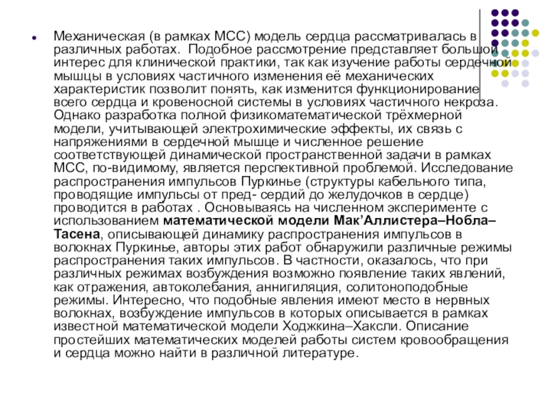 рассмотрение представляет большой интерес для клинической практики, так как изучение работы сердечной мышцы в условиях частичного изменения её механических характеристик позволит понять, как изменится функционирование всего сердца и кровеносной системы в условиях частичного некроза. Однако разработка полной физикоматематической трёхмерной модели, учитывающей электрохимические эффекты, их связь с напряжениями в сердечной мышце и численное решение соответствующей динамической пространственной задачи в рамках МСС, по-видимому, является перспективной проблемой. Исследование распространения импульсов Пуркинье (структуры кабельного типа, проводящие импульсы от пред- сердий до желудочков в сердце) проводится в работах . Основываясь на численном эксперименте с использованием математической модели Мак’Аллистера–Нобла–Тасена, описывающей динамику распространения импульсов в волокнах Пуркинье, авторы этих работ обнаружили различные режимы распространения таких импульсов. В частности, оказалось, что при различных режимах возбуждения возможно появление таких явлений, как отражения, автоколебания, аннигиляция, солитоноподобные режимы. Интересно, что подобные явления имеют место в нервных волокнах, возбуждение импульсов в которых описывается в рамках известной математической модели Ходжкина–Хаксли. Описание простейших математических моделей работы систем кровообращения и сердца можно найти в различной литературе.