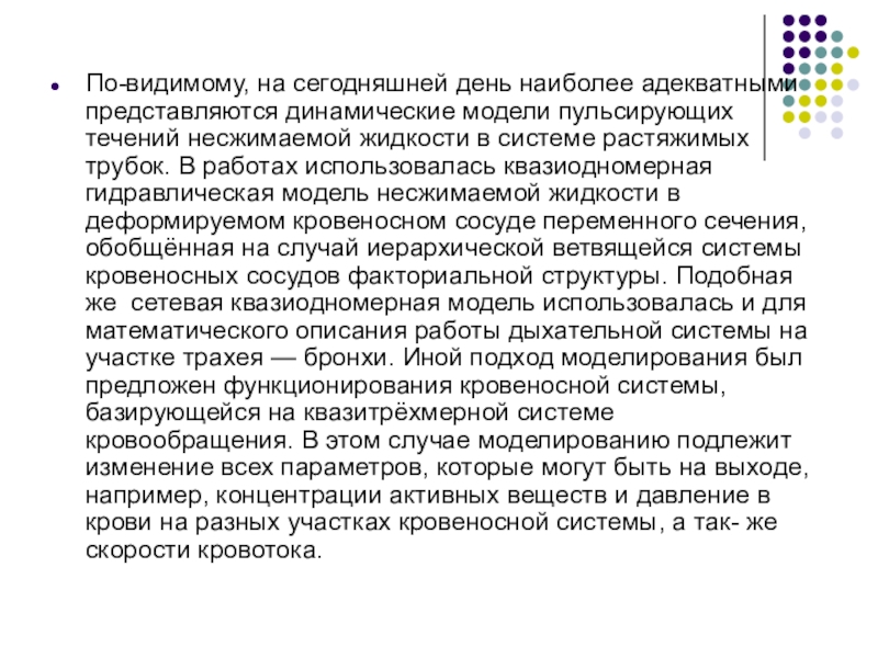 течений несжимаемой жидкости в системе растяжимых трубок. В работах использовалась квазиодномерная гидравлическая модель несжимаемой жидкости в деформируемом кровеносном сосуде переменного сечения, обобщённая на случай иерархической ветвящейся системы кровеносных сосудов факториальной структуры. Подобная же сетевая квазиодномерная модель использовалась и для математического описания работы дыхательной системы на участке трахея — бронхи. Иной подход моделирования был предложен функционирования кровеносной системы, базирующейся на квазитрёхмерной системе кровообращения. В этом случае моделированию подлежит изменение всех параметров, которые могут быть на выходе, например, концентрации активных веществ и давление в крови на разных участках кровеносной системы, а так- же скорости кровотока.