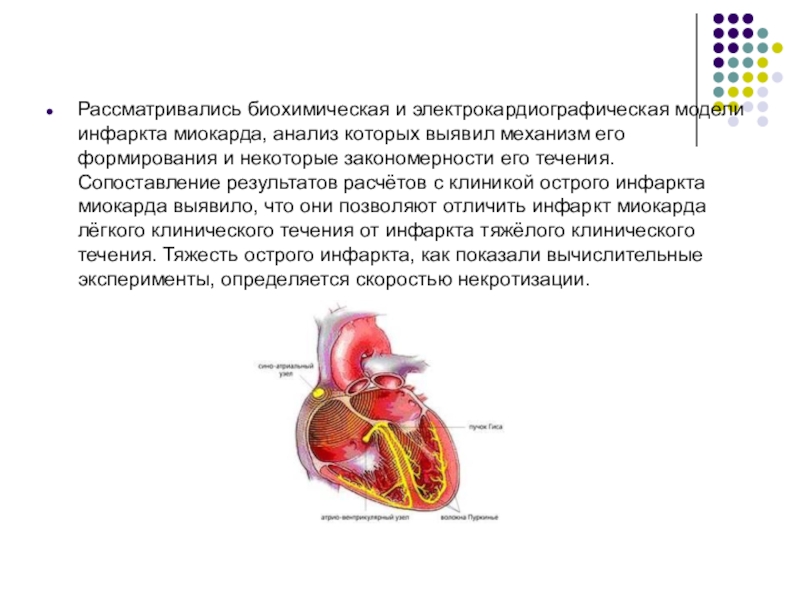 Слайд 4Рассматривались биохимическая и электрокардиографическая модели инфаркта миокарда, анализ которых выявил механизм