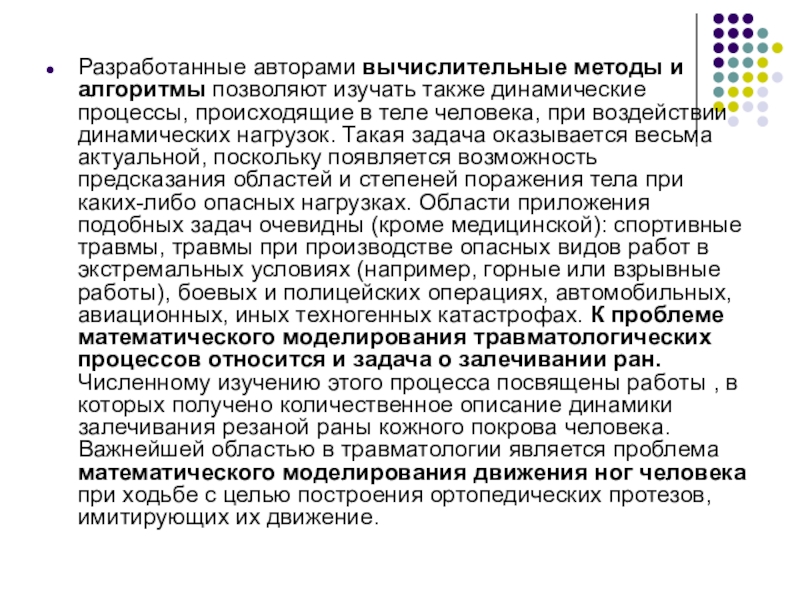 происходящие в теле человека, при воздействии динамических нагрузок. Такая задача оказывается весьма актуальной, поскольку появляется возможность предсказания областей и степеней поражения тела при каких-либо опасных нагрузках. Области приложения подобных задач очевидны (кроме медицинской): спортивные травмы, травмы при производстве опасных видов работ в экстремальных условиях (например, горные или взрывные работы), боевых и полицейских операциях, автомобильных, авиационных, иных техногенных катастрофах. К проблеме математического моделирования травматологических процессов относится и задача о залечивании ран. Численному изучению этого процесса посвящены работы , в которых получено количественное описание динамики залечивания резаной раны кожного покрова человека. Важнейшей областью в травматологии является проблема математического моделирования движения ног человека при ходьбе с целью построения ортопедических протезов, имитирующих их движение.