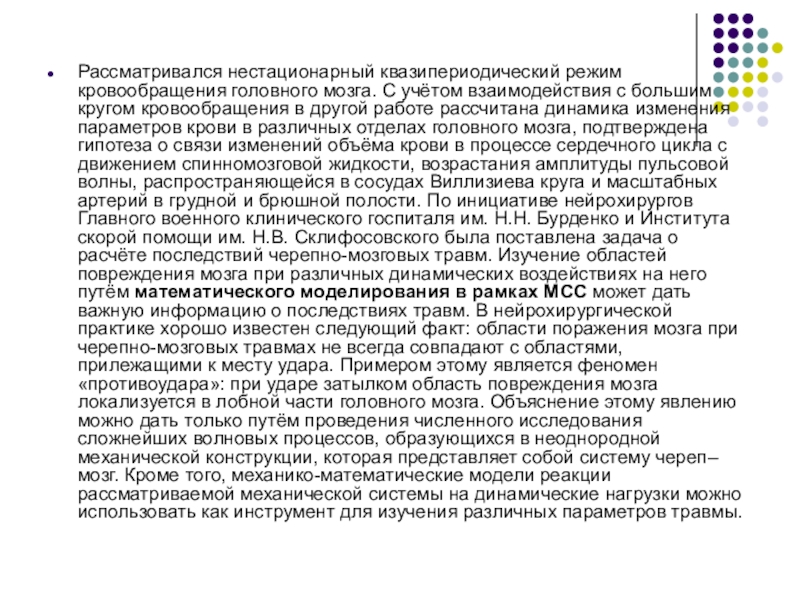большим кругом кровообращения в другой работе рассчитана динамика изменения параметров крови в различных отделах головного мозга, подтверждена гипотеза о связи изменений объёма крови в процессе сердечного цикла с движением спинномозговой жидкости, возрастания амплитуды пульсовой волны, распространяющейся в сосудах Виллизиева круга и масштабных артерий в грудной и брюшной полости. По инициативе нейрохирургов Главного военного клинического госпиталя им. Н.Н. Бурденко и Института скорой помощи им. Н.В. Склифосовского была поставлена задача о расчёте последствий черепно-мозговых травм. Изучение областей повреждения мозга при различных динамических воздействиях на него путём математического моделирования в рамках МСС может дать важную информацию о последствиях травм. В нейрохирургической практике хорошо известен следующий факт: области поражения мозга при черепно-мозговых травмах не всегда совпадают с областями, прилежащими к месту удара. Примером этому является феномен «противоудара»: при ударе затылком область повреждения мозга локализуется в лобной части головного мозга. Объяснение этому явлению можно дать только путём проведения численного исследования сложнейших волновых процессов, образующихся в неоднородной механической конструкции, которая представляет собой систему череп–мозг. Кроме того, механико-математические модели реакции рассматриваемой механической системы на динамические нагрузки можно использовать как инструмент для изучения различных параметров травмы.