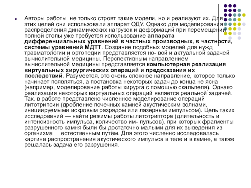 Для этих целей они использовали аппарат ОДУ. Однако для моделирования распределения динамических нагрузок и деформаций при перемещении полной стопы уже требуется использование аппарата дифференциальных уравнений в частных производных, в частности, системы уравнений МДТТ. Создание подобных моделей для нужд травматологии и ортопедии представляется но- вой и актуальной задачей вычислительной медицины. Перспективным направлением вычислительной медицины представляется компьютерная реализация виртуальных хирургических операций и предсказания их последствий. Разумеется, это очень сложное направление, которое только начинает появляться, а постановка некоторых задач до конца не ясна (например, моделирование работы хирурга с помощью скальпеля). Однако реализация некоторых виртуальных операций является реальной задачей. Так, в работе представлено численное моделирование операций литотрипсии (дробление почечных камней акустическим волнами, инициируемыми искровым разрядом или лазерным импульсом). Цель таких исследований — найти режимы работы литотриптора (длительность и интенсивность импульса, количество им- пульсов), при которых фрагменты разрушенного камня были бы достаточно малыми для их выведения из организма естественным путём. Для этого численно исследовалась картина распространения акустического импульса в теле и в камне, а также решалась задача его разрушения.