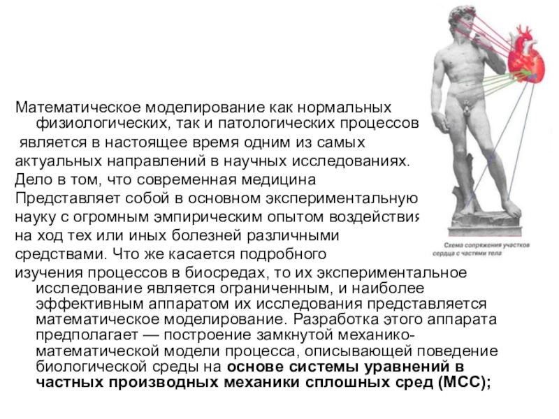 изучения процессов в биосредах, то их экспериментальное исследование является ограниченным, и наиболее эффективным аппаратом их исследования представляется математическое моделирование. Разработка этого аппарата предполагает — построение замкнутой механико-математической модели процесса, описывающей поведение биологической среды на основе системы уравнений в частных производных механики сплошных сред (МСС);
