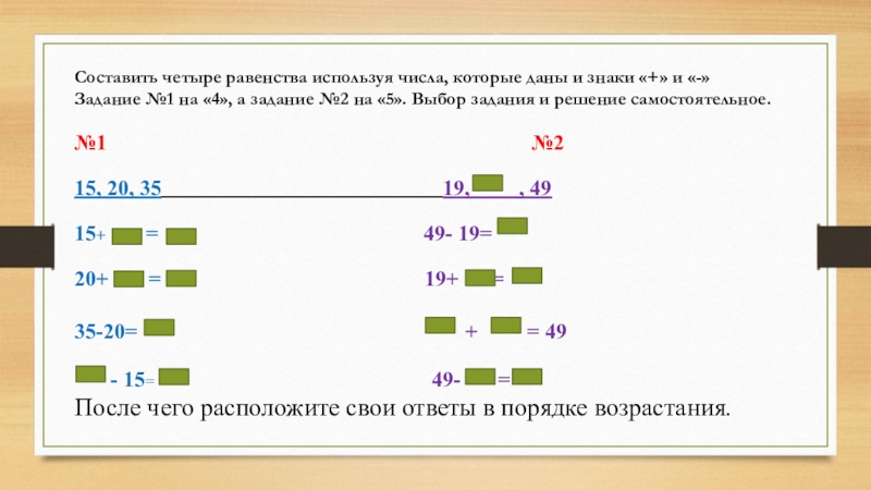 Слайд 6Составить четыре равенства используя числа, которые даны и знаки «+» и