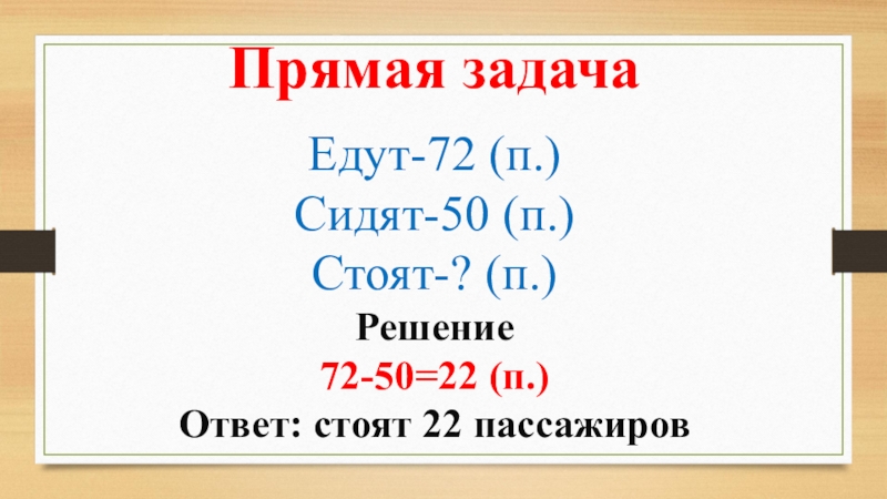Прямая задачаЕдут-72 (п.)Сидят-50 (п.)Стоят-? (п.)Решение72-50=22 (п.)Ответ: стоят 22 пассажиров
