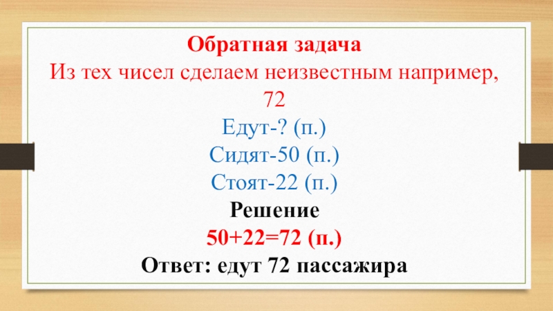 Обратная задачаИз тех чисел сделаем неизвестным например, 72Едут-? (п.)Сидят-50 (п.)Стоят-22 (п.)Решение50+22=72 (п.)Ответ: едут 72 пассажира