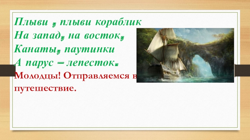 Плыви , плыви корабликНа запад, на восток, Канаты, паутинкиА парус – лепесток.Молодцы! Отправляемся в путешествие.