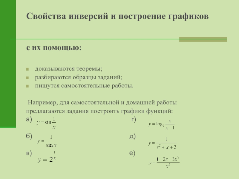 в 10 классе (повторение всех преобразований при построении графиков тригонометрических функций, функций, содержащих целую и дробную часть, построение графиков с помощью инверсий относительно осей координат, построение графиков с помощью пределов и производных).