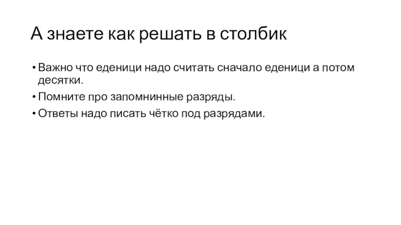 А знаете как решать в столбикВажно что еденици надо считать сначало еденици а потом десятки.Помните про запомнинные