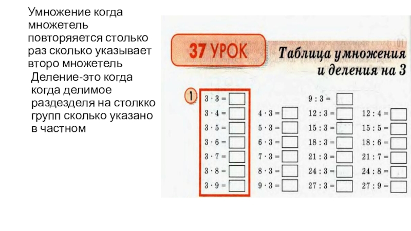 Умножение когда множетель повторяяется столько раз сколько указывает второ множетель Деление-это когда когда делимое раздезделя на столкко