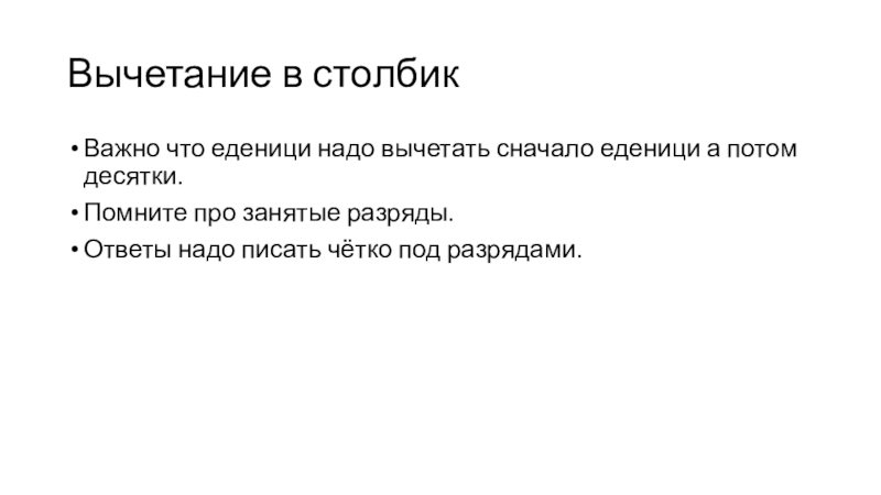 Вычетание в столбикВажно что еденици надо вычетать сначало еденици а потом десятки.Помните про занятые разряды.Ответы надо писать