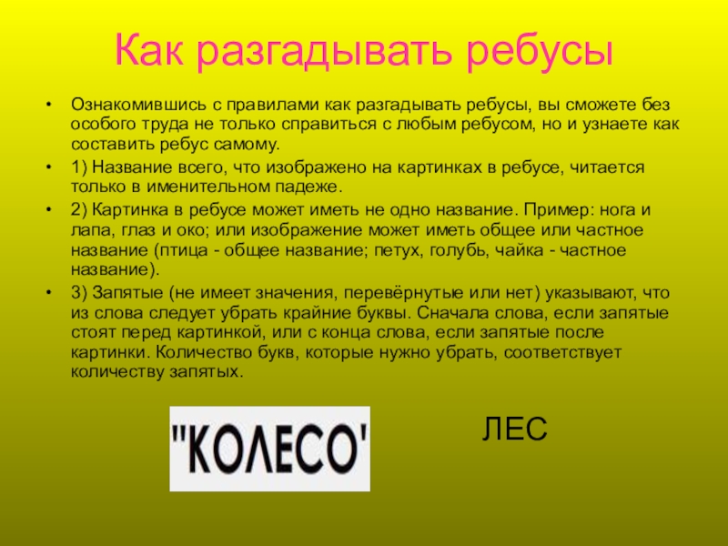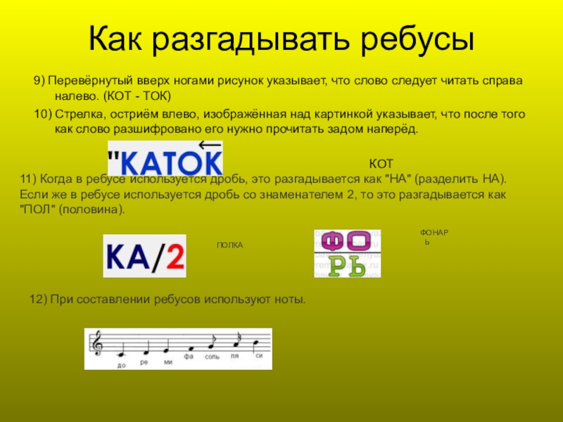 11) Когда в ребусе используется дробь, это разгадывается как "НА" (разделить НА). Если же в ребусе используется дробь со знаменателем 2, то это разгадывается как "ПОЛ" (половина).