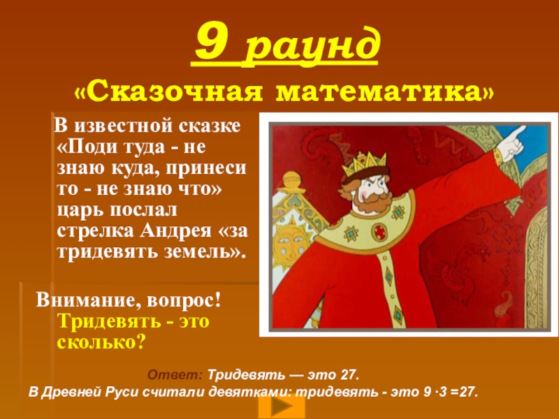 В Древней Руси считали девятками: тридевять - это 9 ∙3 =27.