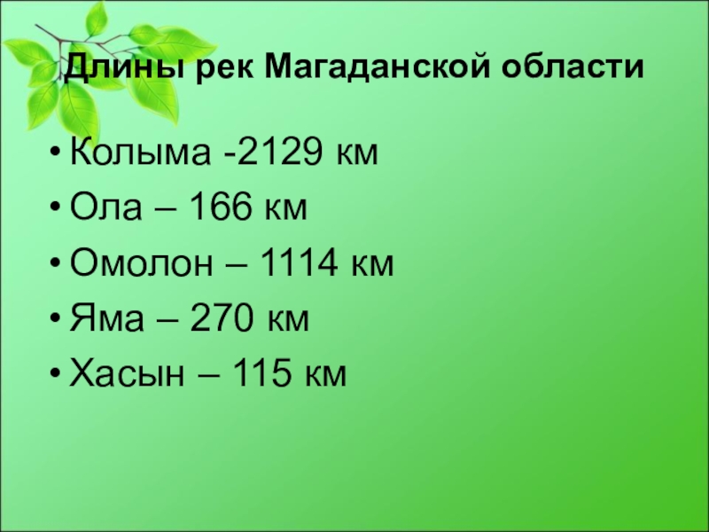 Длины рек Магаданской областиКолыма -2129 кмОла – 166 кмОмолон – 1114 кмЯма – 270 кмХасын – 115