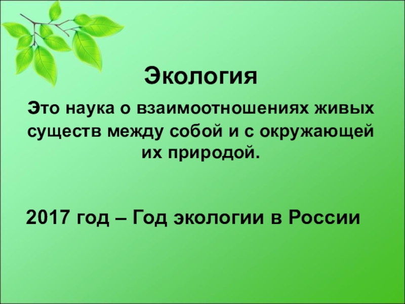 Экология это наука о взаимоотношениях живых существ между собой и с окружающей их природой.2017 год – Год экологии в России