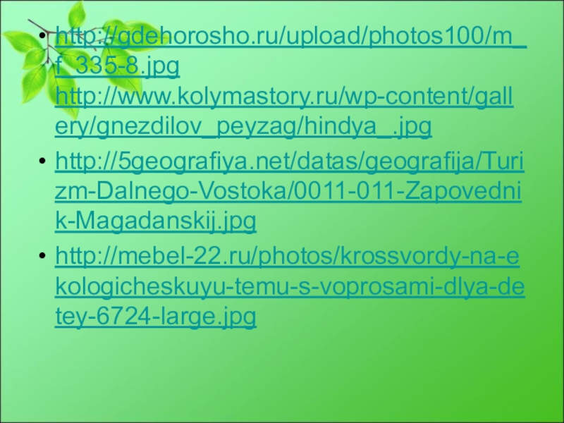 http://gdehorosho.ru/upload/photos100/m_f_335-8.jpg http://www.kolymastory.ru/wp-content/gallery/gnezdilov_peyzag/hindya_.jpghttp://5geografiya.net/datas/geografija/Turizm-Dalnego-Vostoka/0011-011-Zapovednik-Magadanskij.jpghttp://mebel-22.ru/photos/krossvordy-na-ekologicheskuyu-temu-s-voprosami-dlya-detey-6724-large.jpg