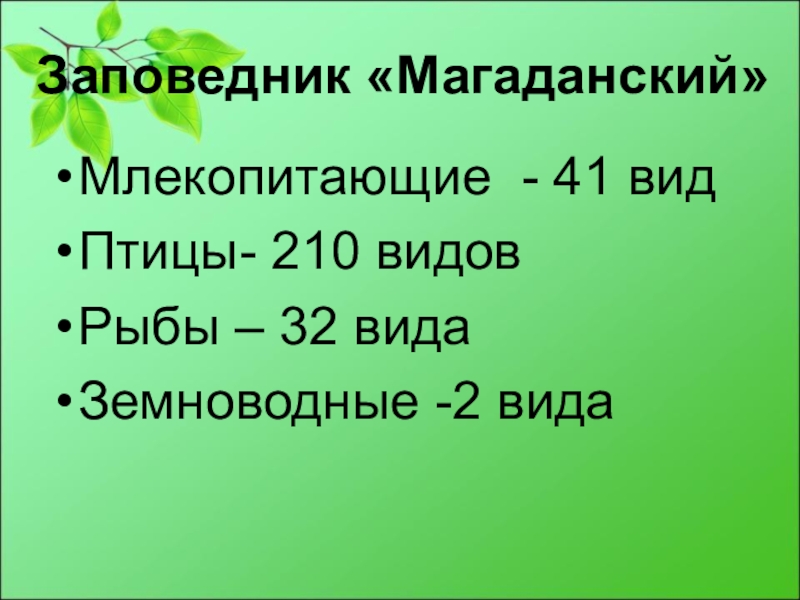 Заповедник «Магаданский»Млекопитающие - 41 видПтицы- 210 видовРыбы – 32 видаЗемноводные -2 вида
