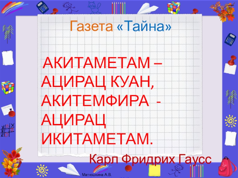 Газета «Тайна»  АКИТАМЕТАМ – АЦИРАЦ КУАН, АКИТЕМФИРА - АЦИРАЦ ИКИТАМЕТАМ.Карл Фридрих Гаусс