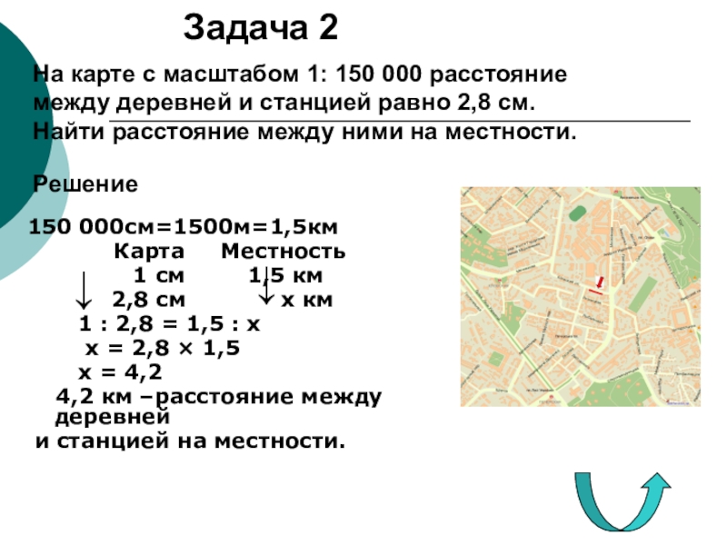 На карте с масштабом 1: 150 000 расстояние между деревней и станцией равно 2,8 см. Найти расстояние между ними на местности.