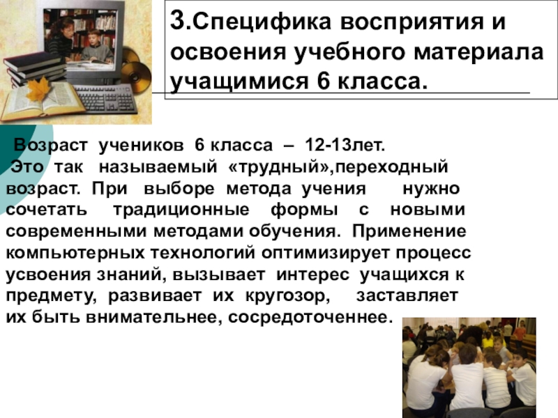 3.Специфика восприятия и освоения учебного материала учащимися 6 класса.