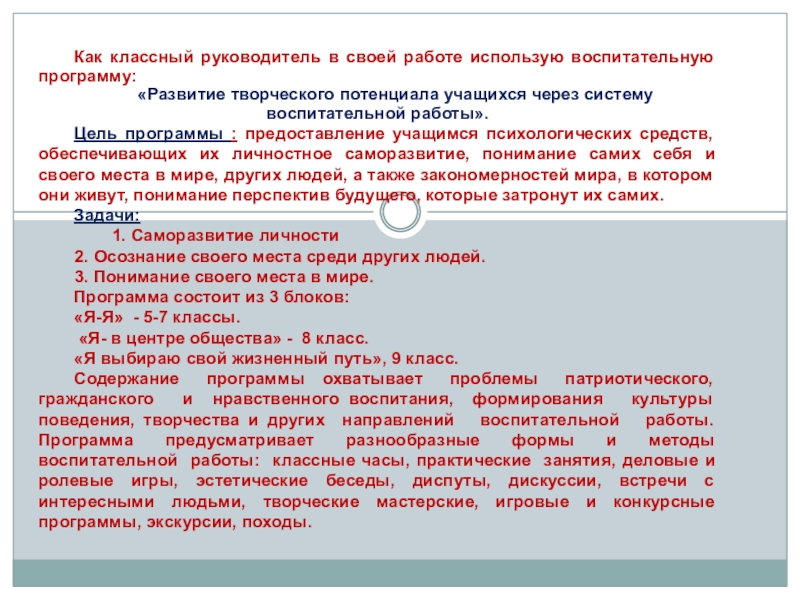 Слайд 18Как классный руководитель в своей работе использую воспитательную программу: