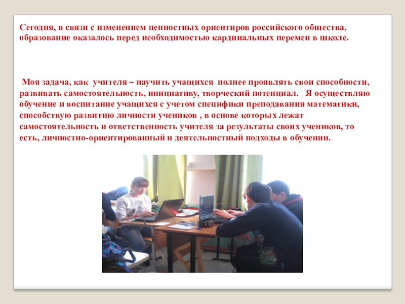 Моя задача, как учителя – научить учащихся полнее проявлять свои способности, развивать самостоятельность, инициативу, творческий потенциал. Я осуществляю обучение и воспитание учащихся с учетом специфики преподавания математики, способствую развитию личности учеников , в основе которых лежат самостоятельность и ответственность учителя за результаты своих учеников, то есть, личностно-ориентированный и деятельностный подходы в обучении.