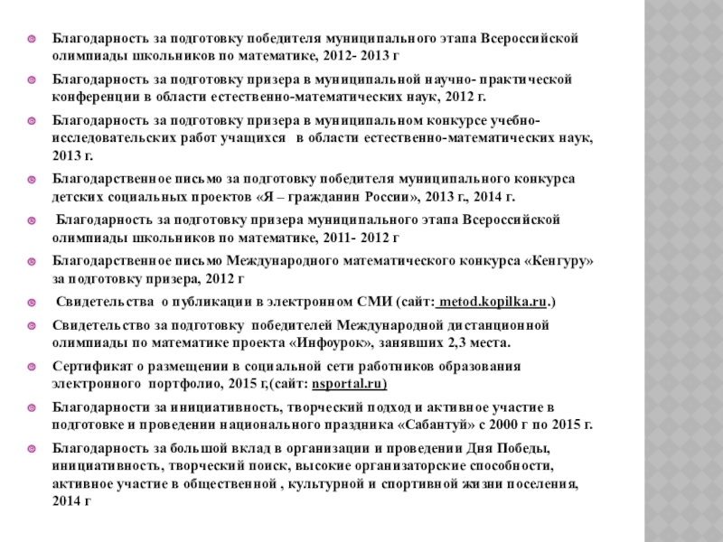 Слайд 31Благодарность за подготовку победителя муниципального этапа Всероссийской олимпиады школьников по математике,