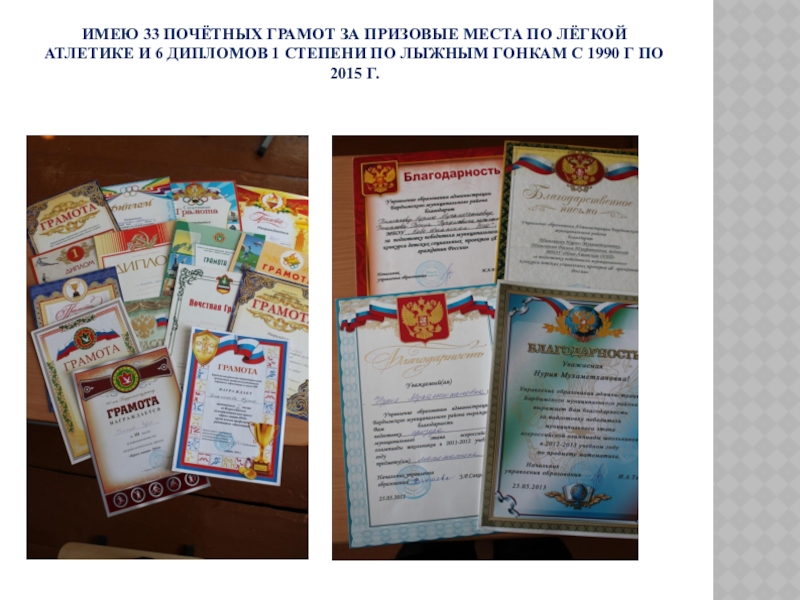 Слайд 33ИМЕЮ 33 ПОЧЁТНЫХ ГРАМОТ ЗА ПРИЗОВЫЕ МЕСТА ПО ЛЁГКОЙ АТЛЕТИКЕ И