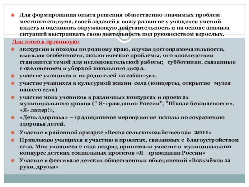 Слайд 22Для формирования опыта решения общественно-значимых проблем местного социума, своей задачей я
