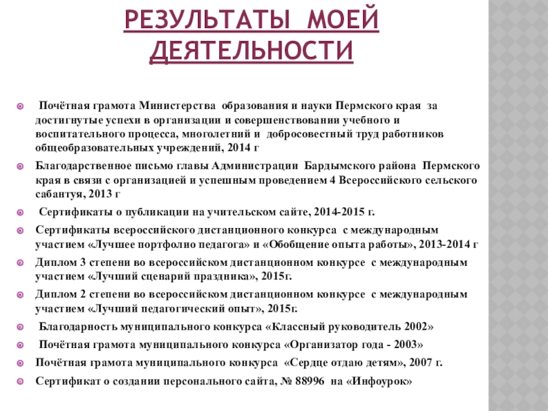 Слайд 30РЕЗУЛЬТАТЫ МОЕЙ ДЕЯТЕЛЬНОСТИ
