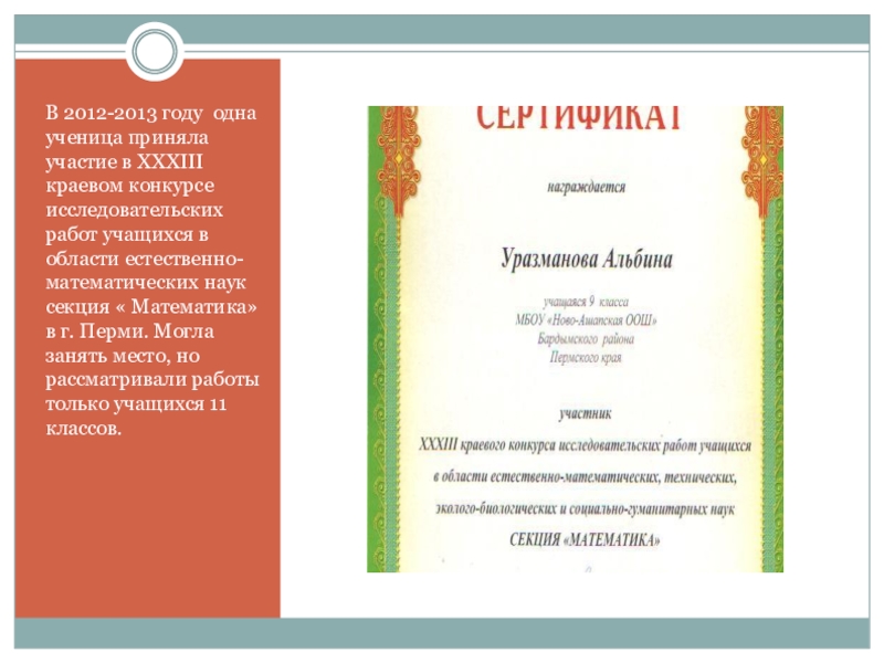 исследовательских работ учащихся в области естественно-математических наук секция « Математика» в г. Перми. Могла занять место, но рассматривали работы только учащихся 11 классов.