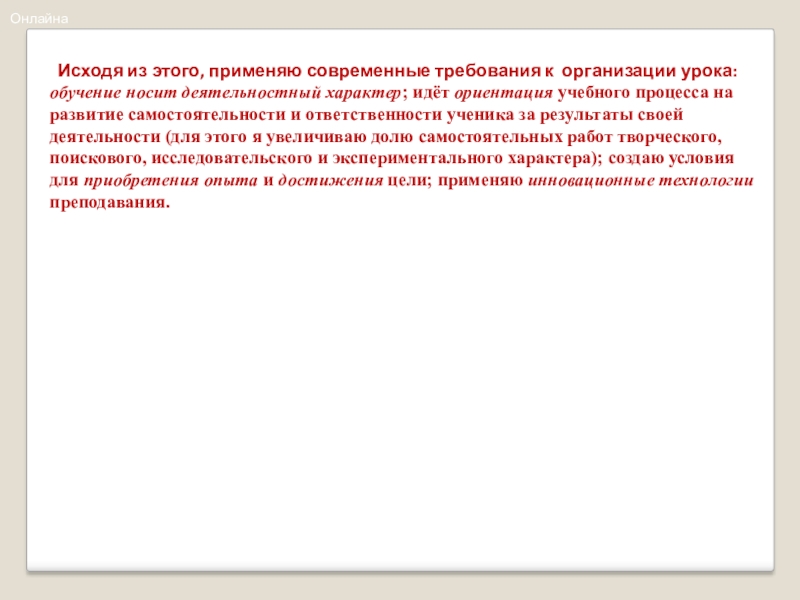 Слайд 7 Исходя из этого, применяю современные требования к организации урока: