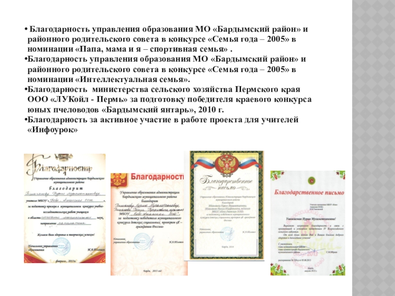 Благодарность управления образования МО «Бардымский район» и районного родительского совета в конкурсе «Семья года – 2005» в номинации «Интеллектуальная семья».