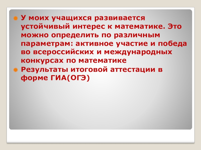 Слайд 15У моих учащихся развивается устойчивый интерес к математике. Это можно определить