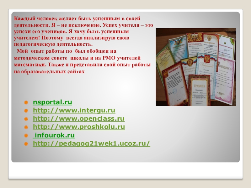Мой опыт работы по был обобщен на методическом совете школы и на РМО учителей математики. Также я представила свой опыт работы на образовательных сайтах